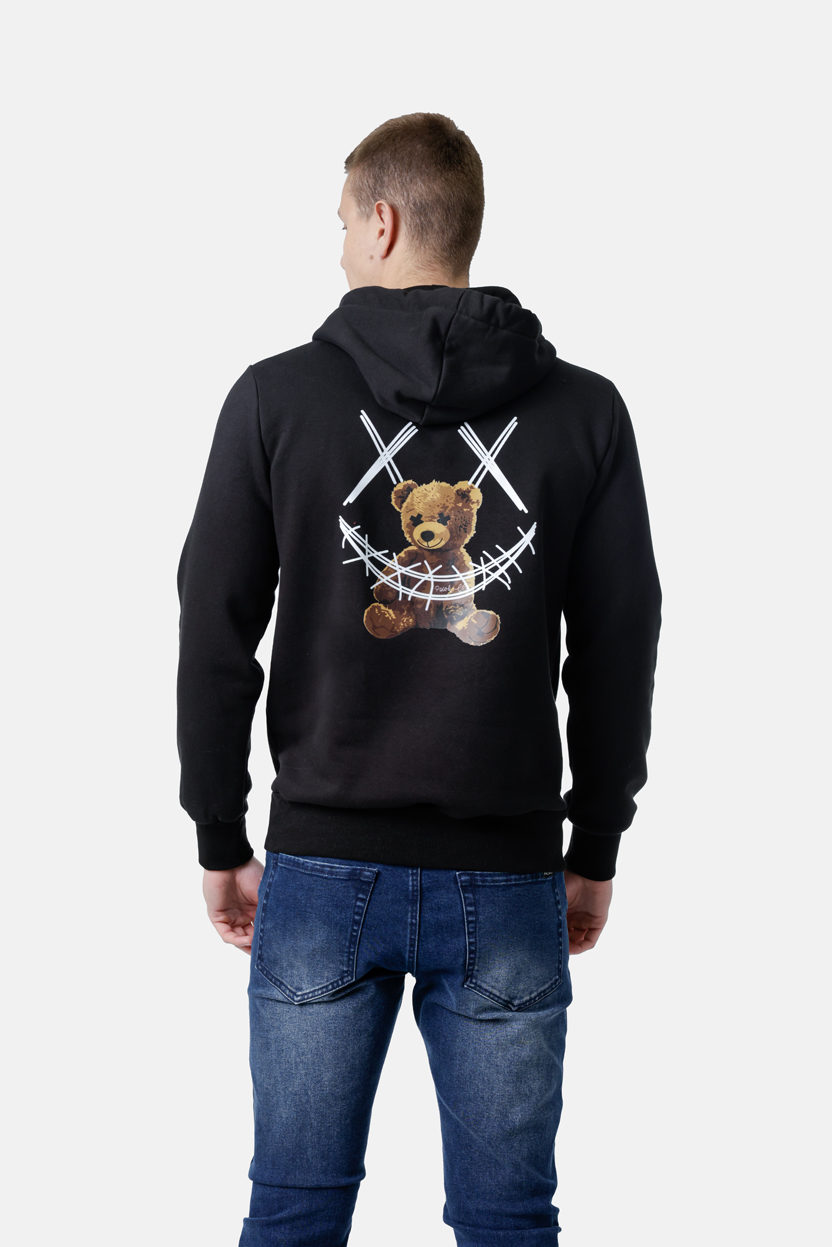 Ανδρική μπλούζα φούτερ με κουκούλα και τύπωμα αρκουδάκι μικρό στο μπροστινό μέρος και μεγάλο τύπωμα στο πίσω μέρος, τσέπη καγκουρό και κανονική εφαρμογή.