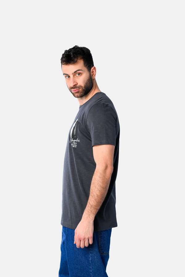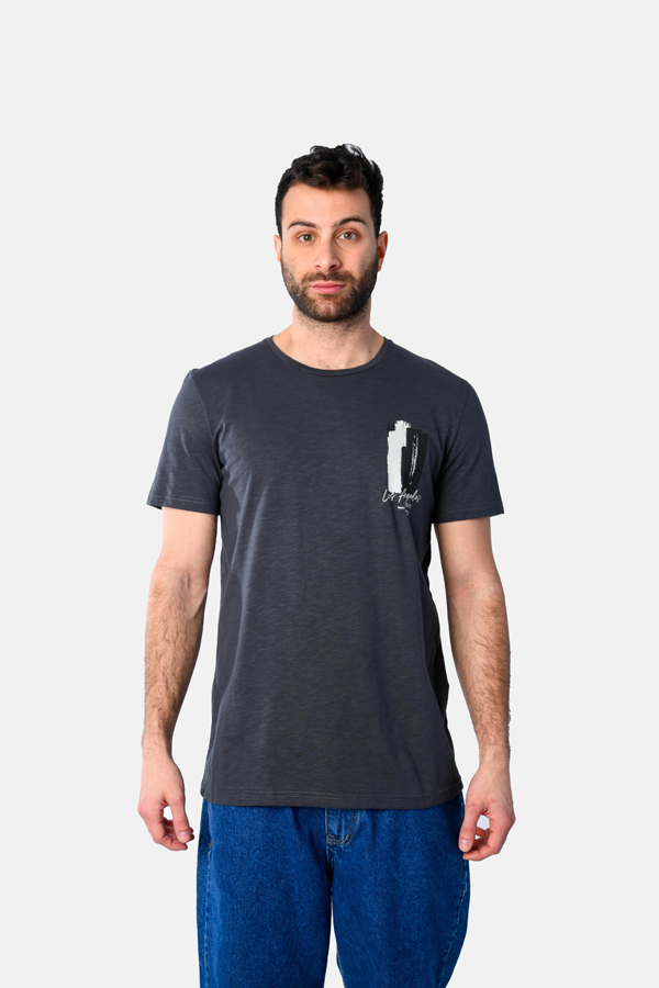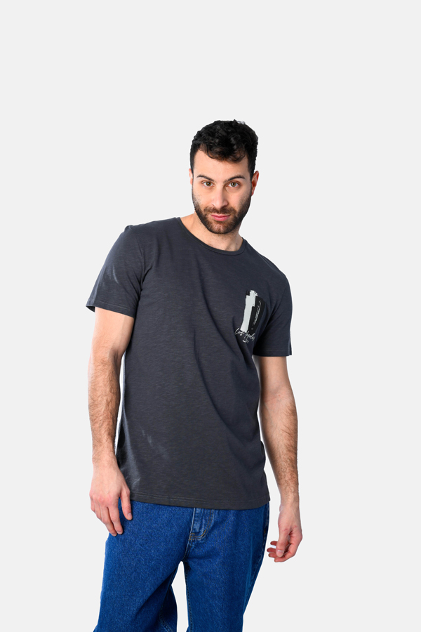 Ανδρική κοντομάνικη βαμβακερή μπλούζα με στάμπα μπροστά και κανονική εφαρμογή.