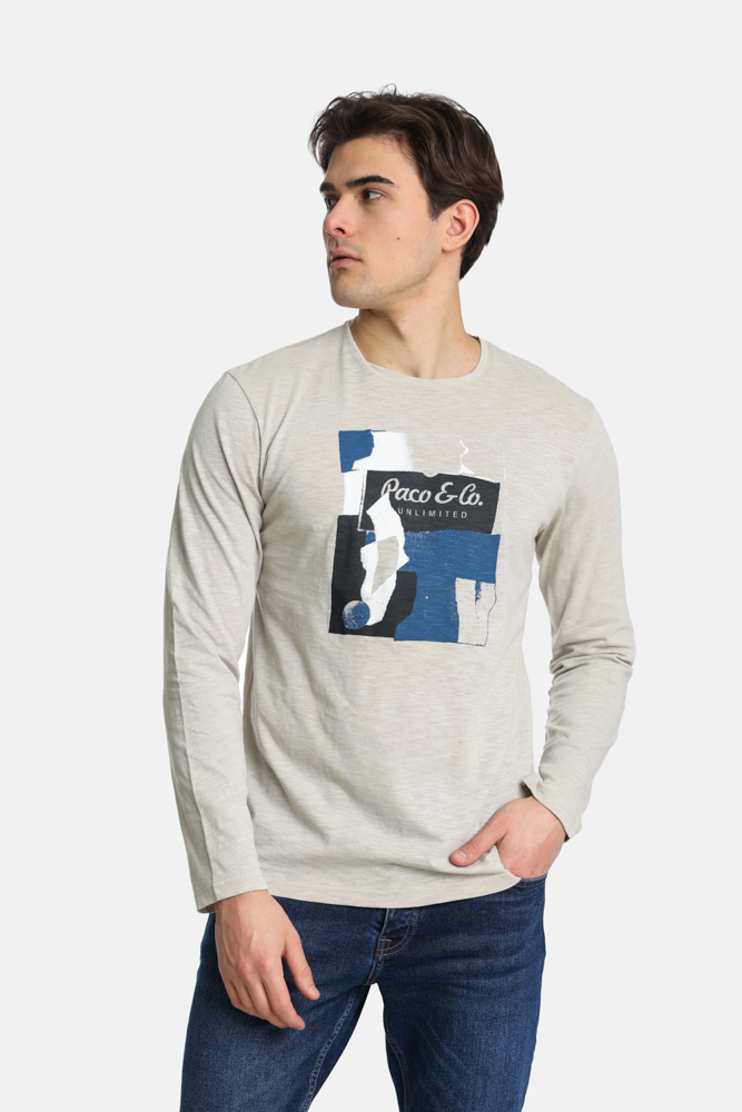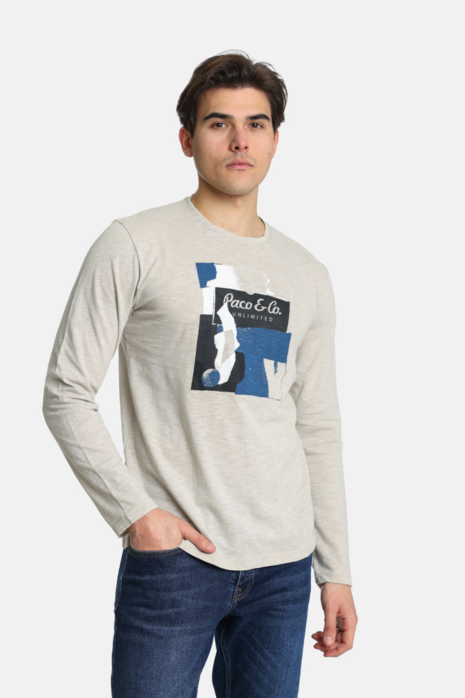 Ανδρική μπλούζα μακό με μακρύ μανίκι, στρόγγυλη λαιμόκοψη, μεγάλη στάμπα μπροστά και κανονική εφαρμογή.