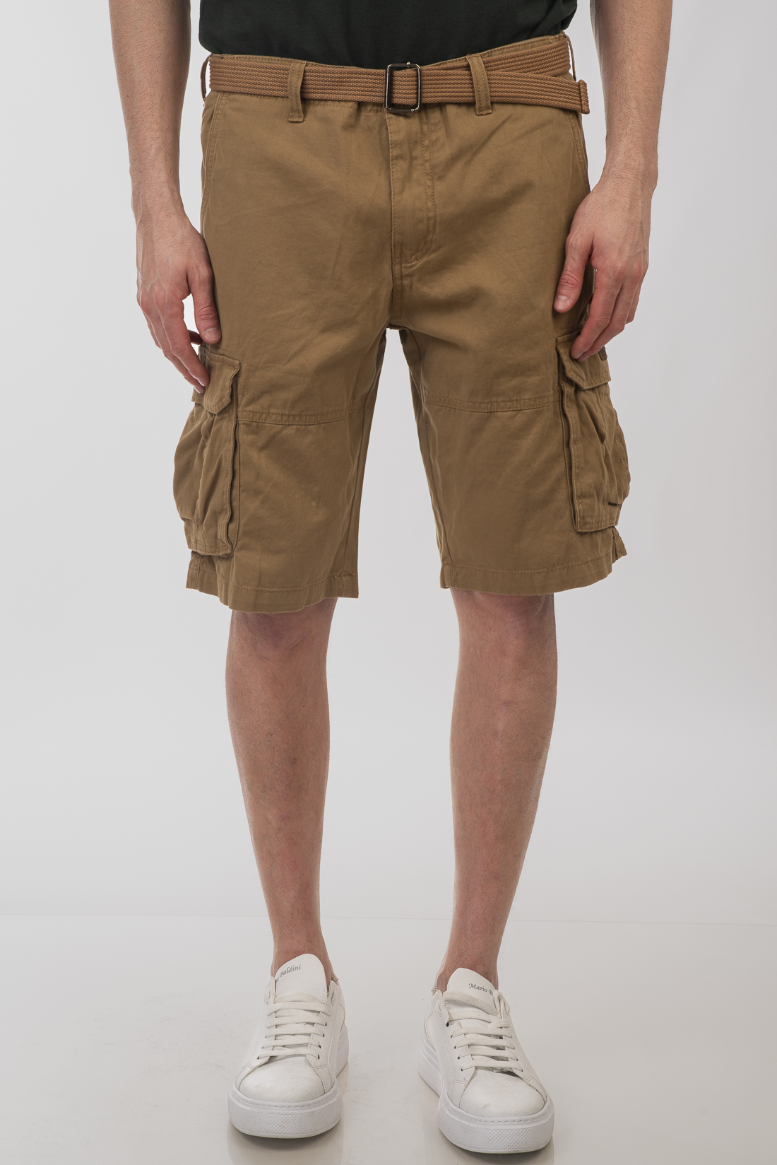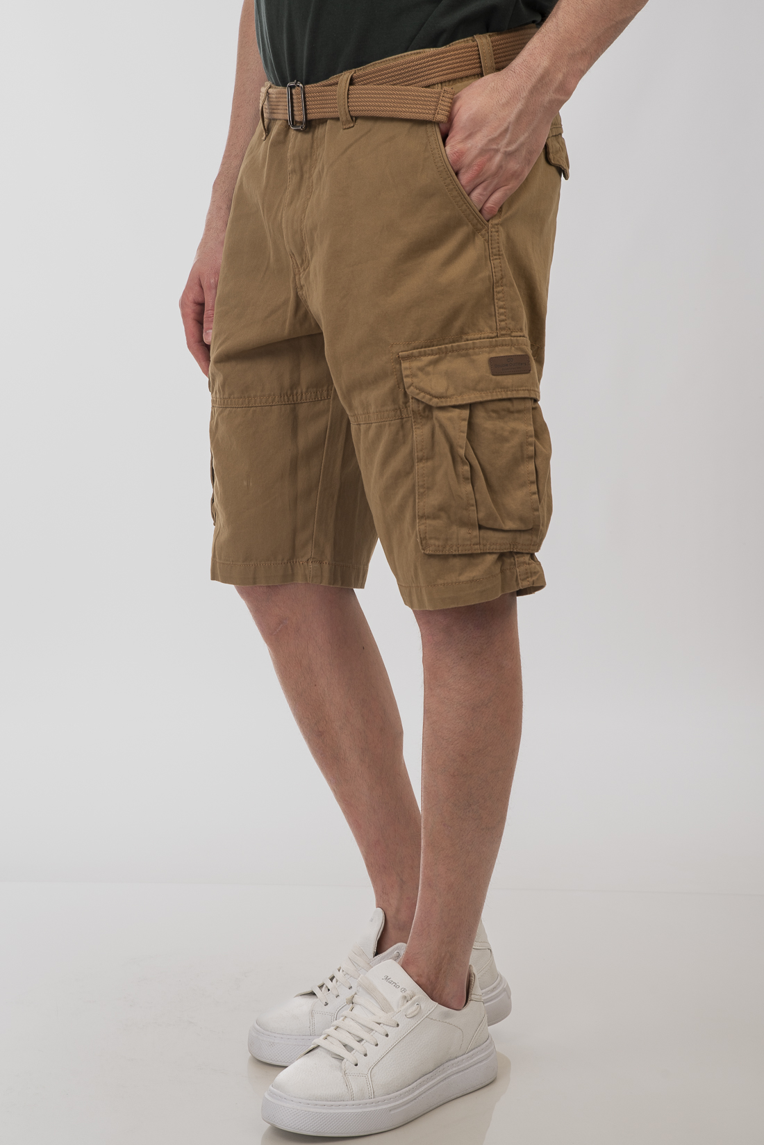Ανδρική υφασμάτινη βερμούδα cargo, με πλαϊνές τσέπες και χαλαρή εφαρμογή. Κλείσιμο με φερμουάρ και κουμπί και ζώνη με μεταλλική αγκράφα .