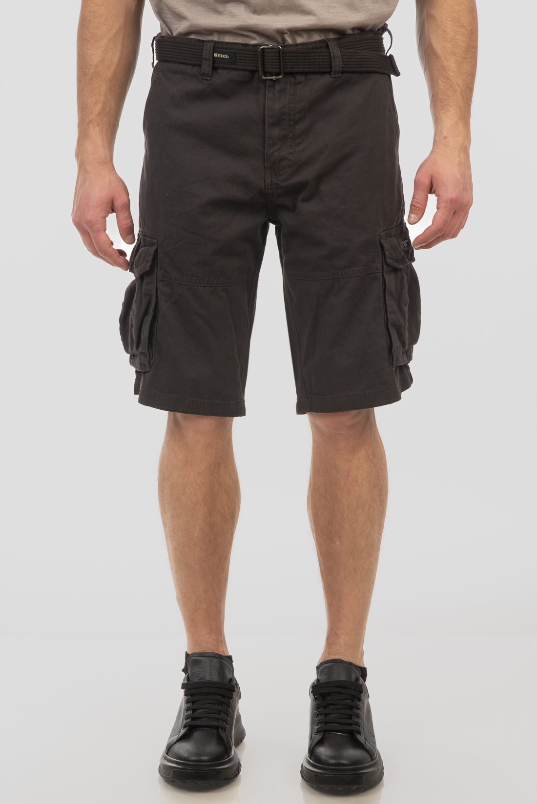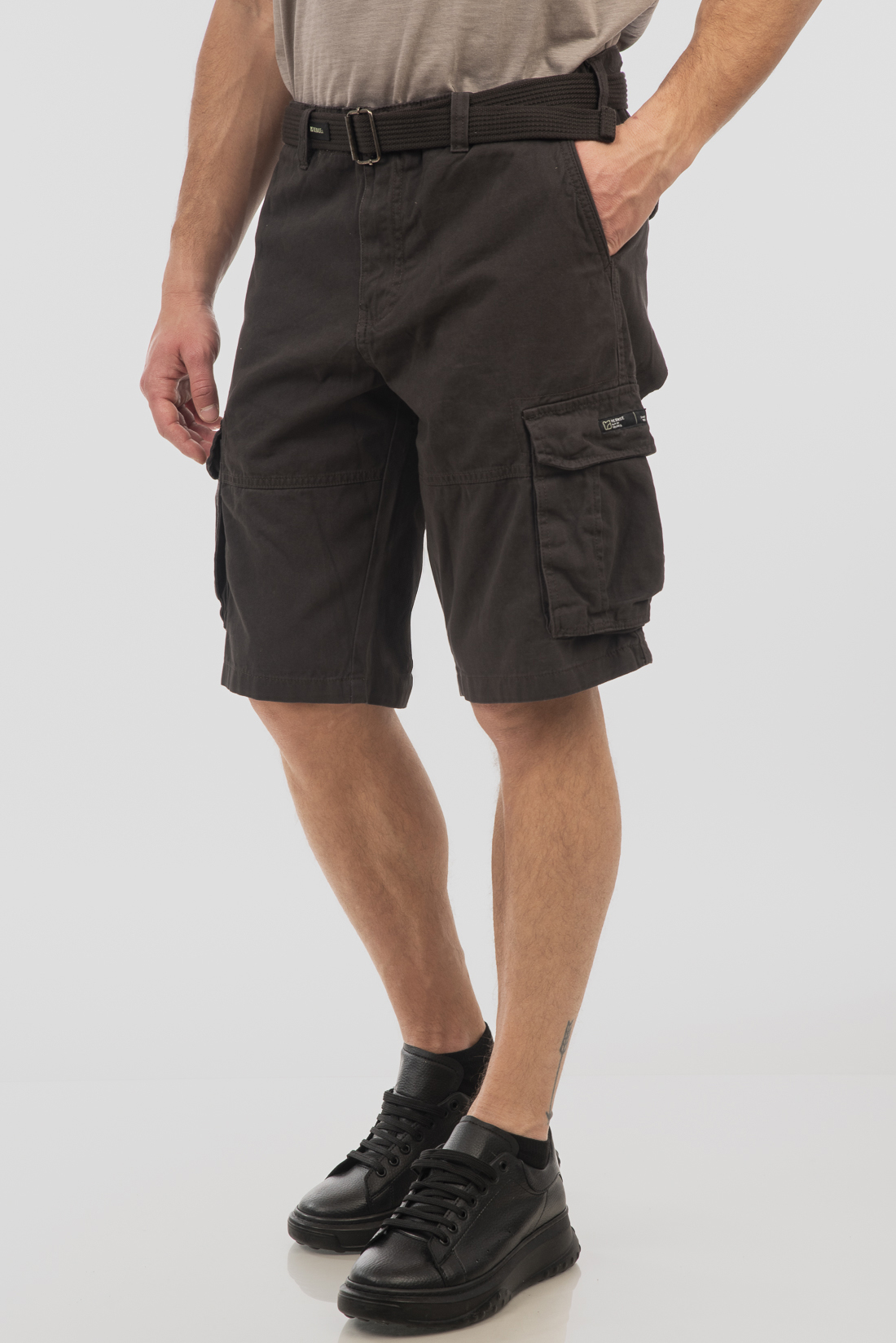 Ανδρική υφασμάτινη βερμούδα με τσέπες στα πλάγια, κλείσιμο με φερμουάρ και κουμπί, ζώνη στη μέση και χαλαρή εφαρμογή.