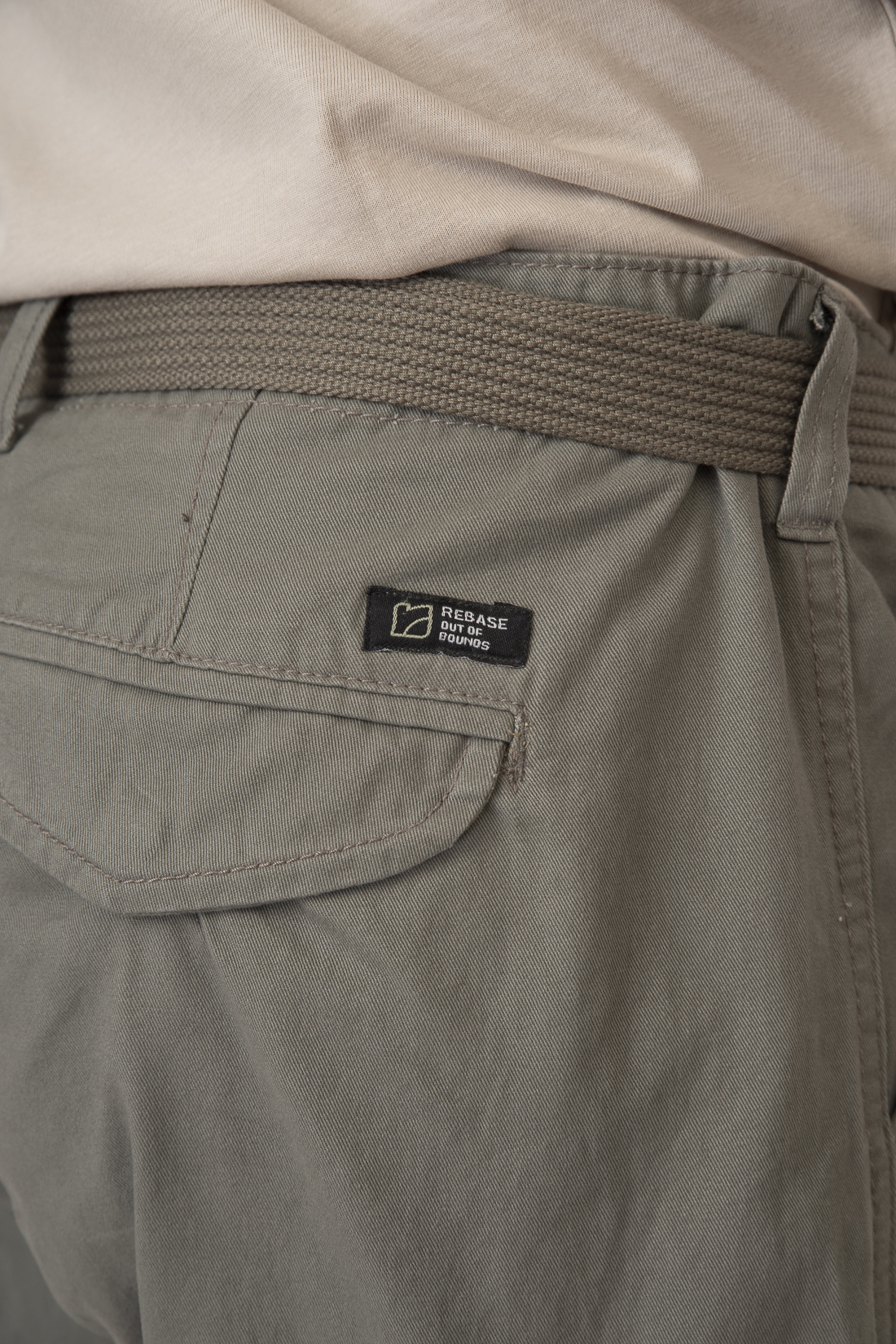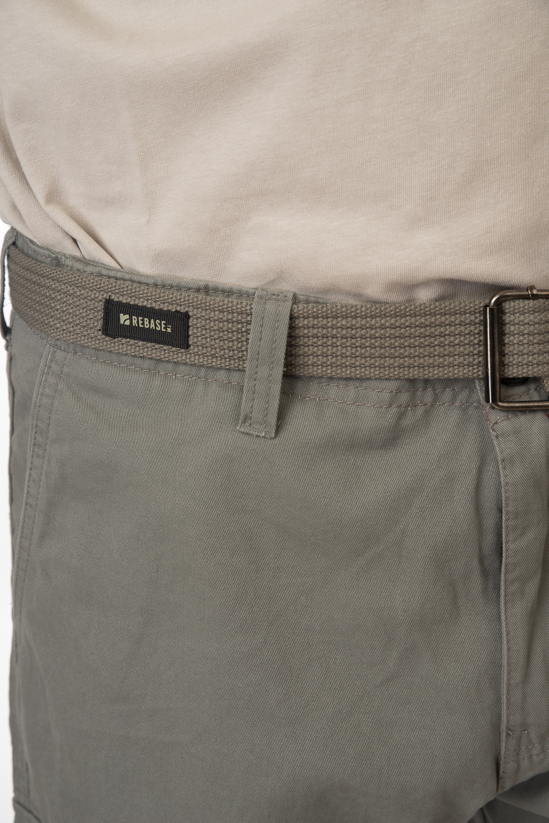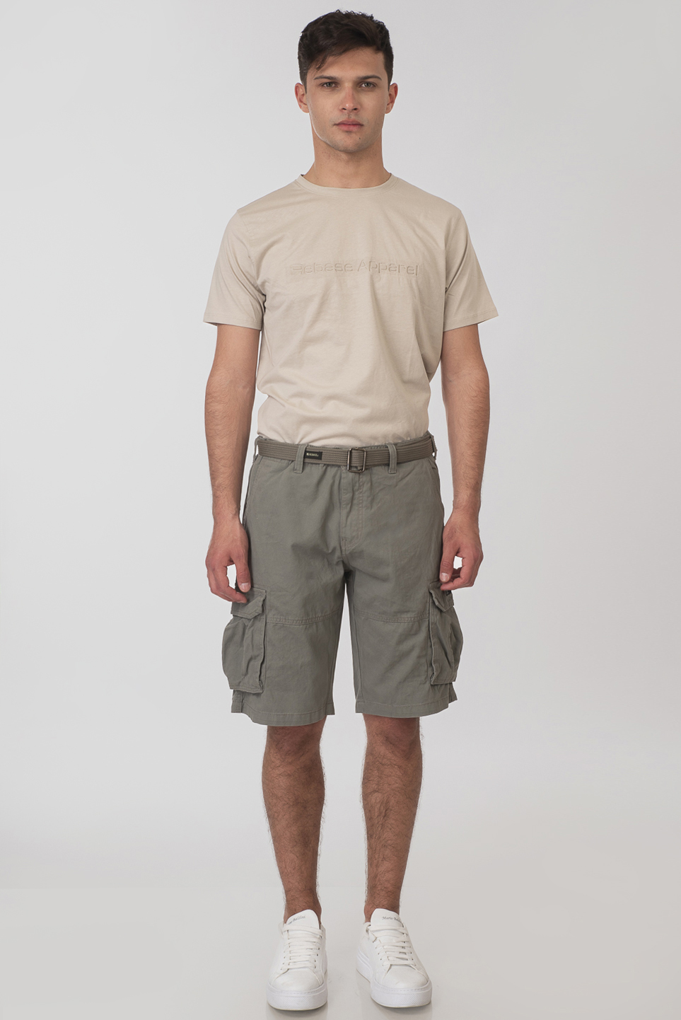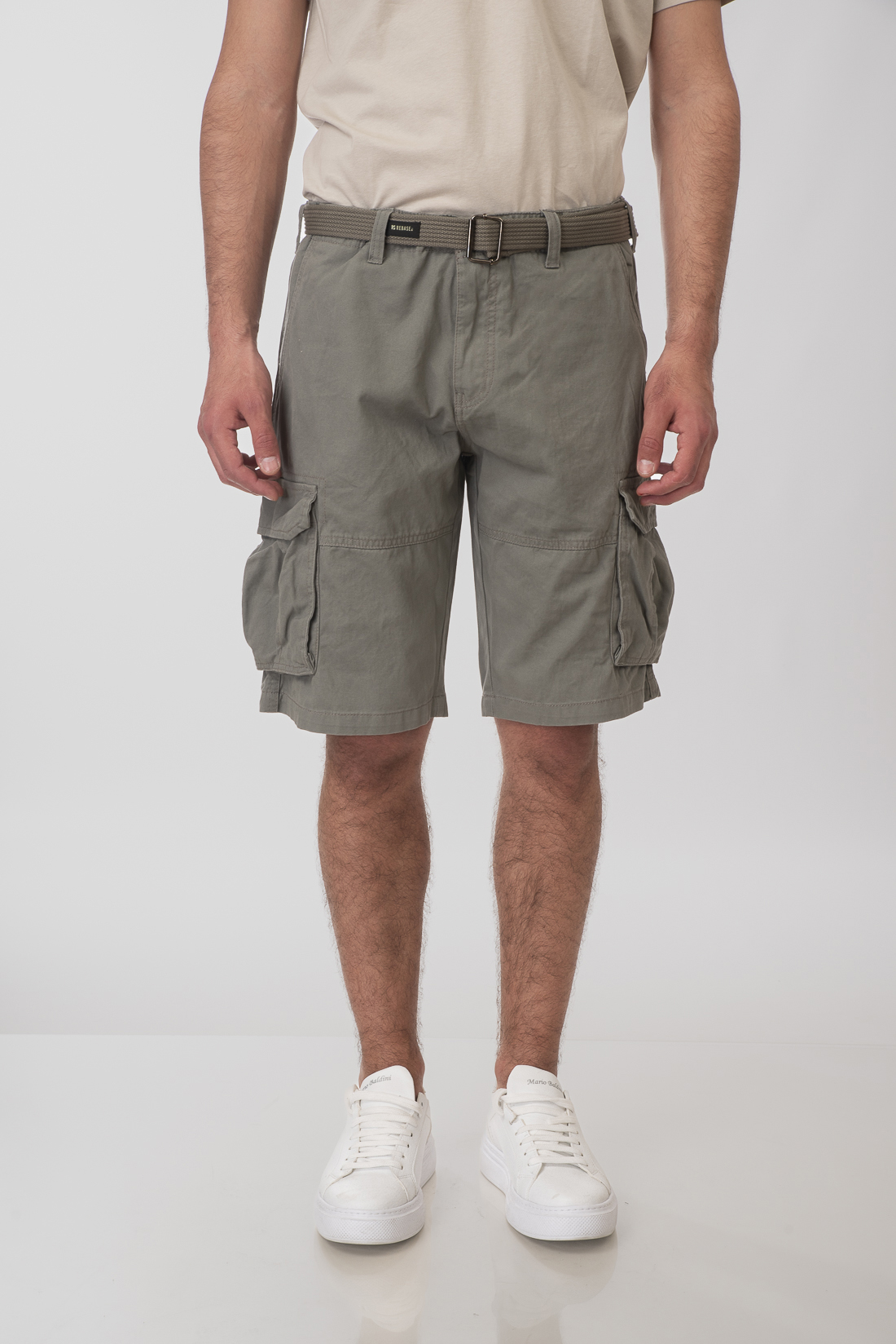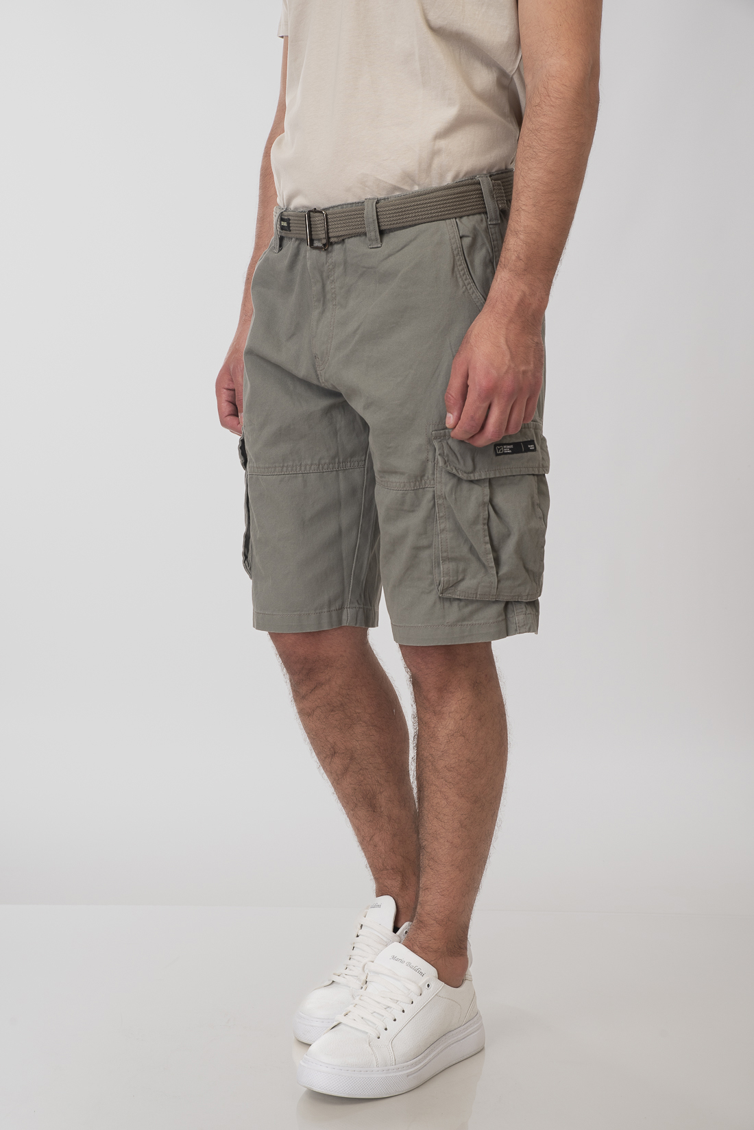 Ανδρική υφασμάτινη βερμούδα με τσέπες στα πλάγια, κλείσιμο με φερμουάρ και κουμπί, ζώνη στη μέση και χαλαρή εφαρμογή.