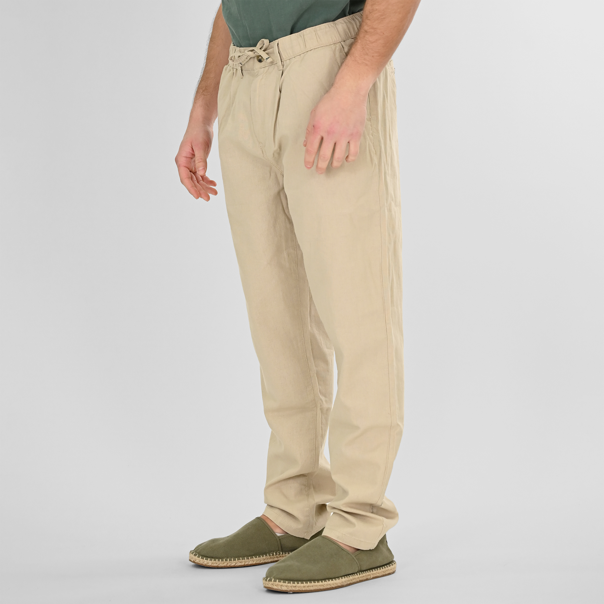 Ανδρικό παντελόνι λινό με λάστιχο στη μέση, ίσιο κάτω στο τελείωμα και κανονική εφαρμογή.