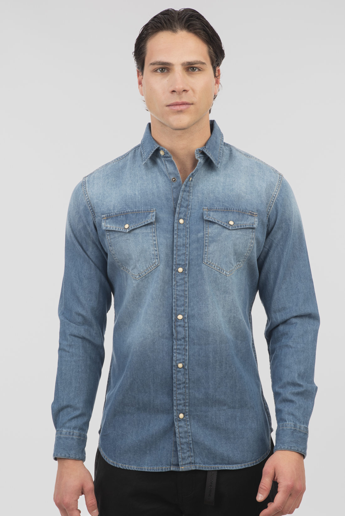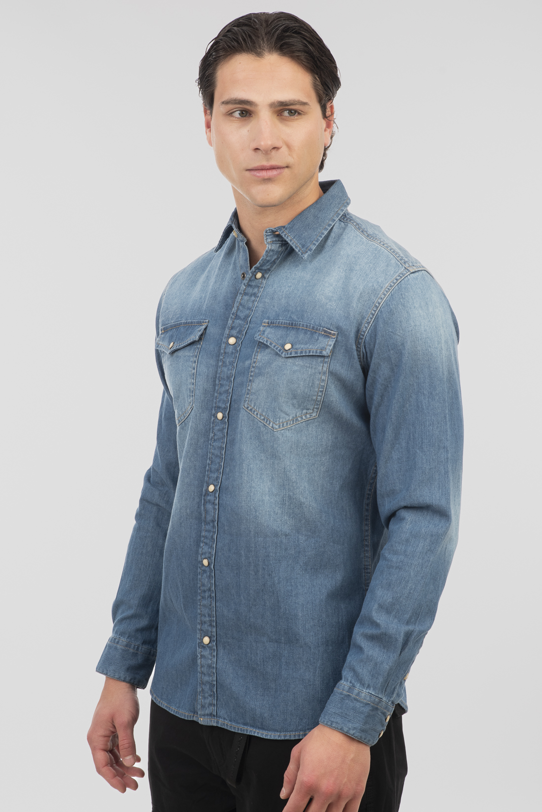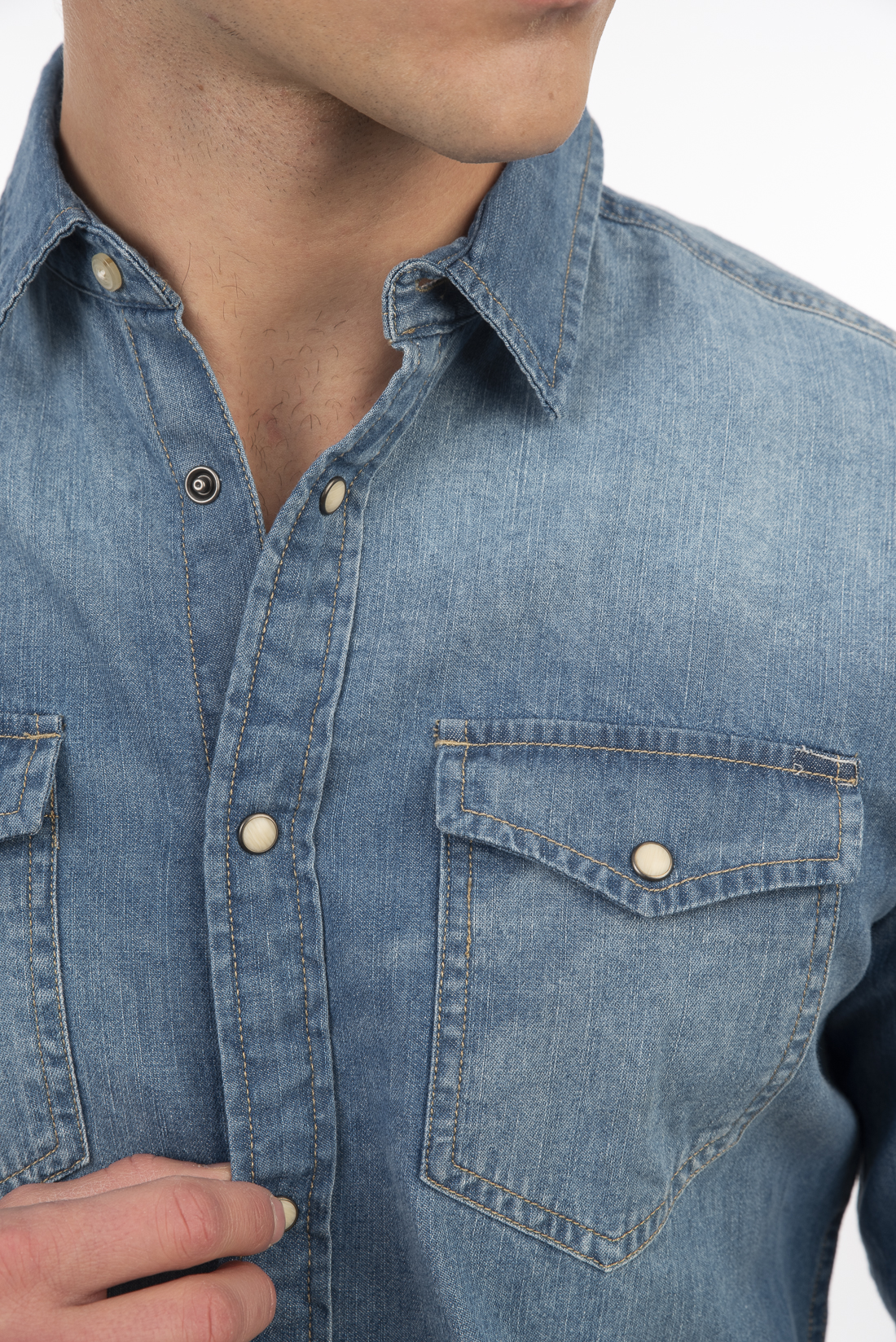 Ανδρικό τζιν πουκάμισο με μακρύ μανίκι, κλείσιμο με κουμπιά, τσέπες μπροστά που κλείνουν με κουμπιά και κανονική εφαρμογή.