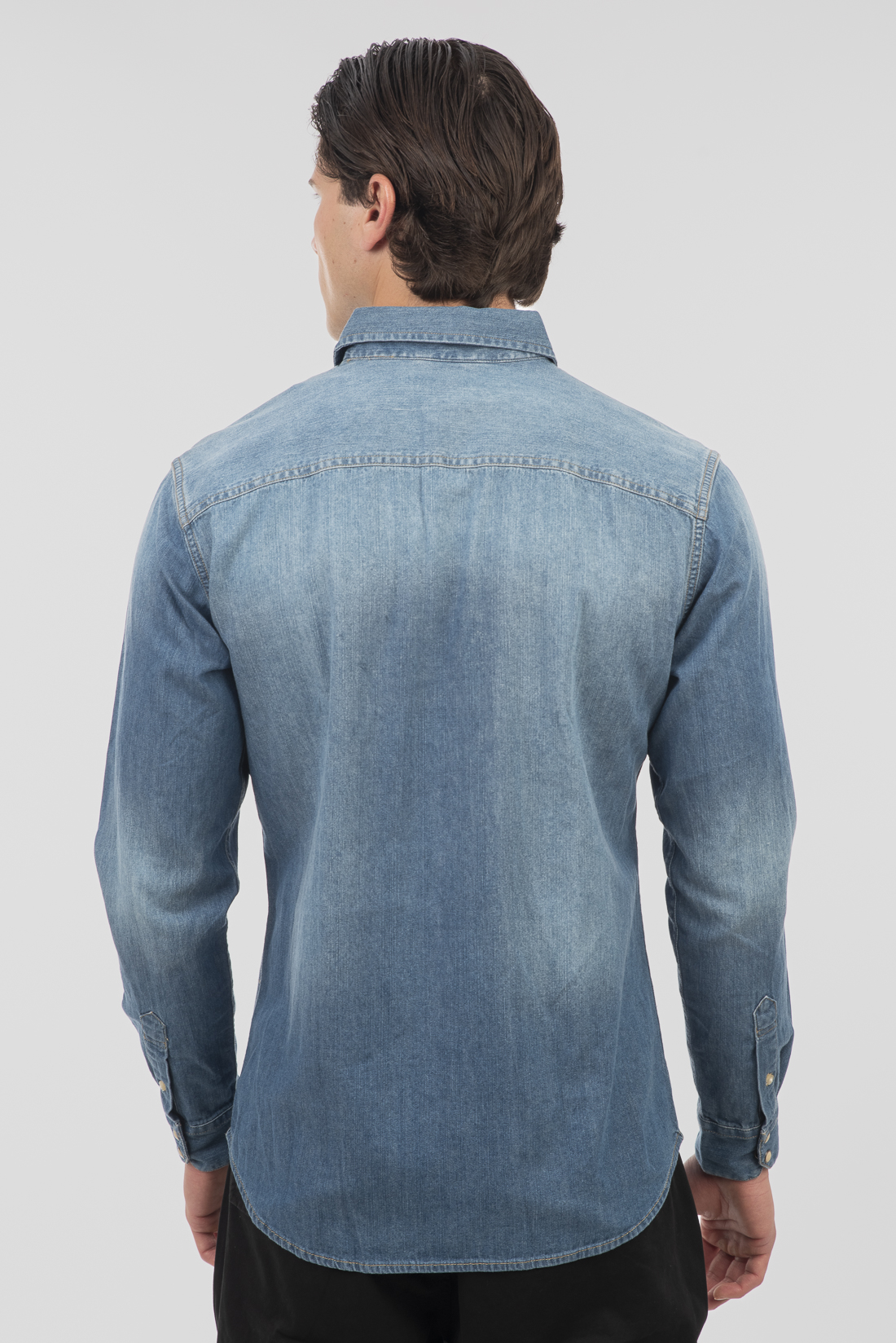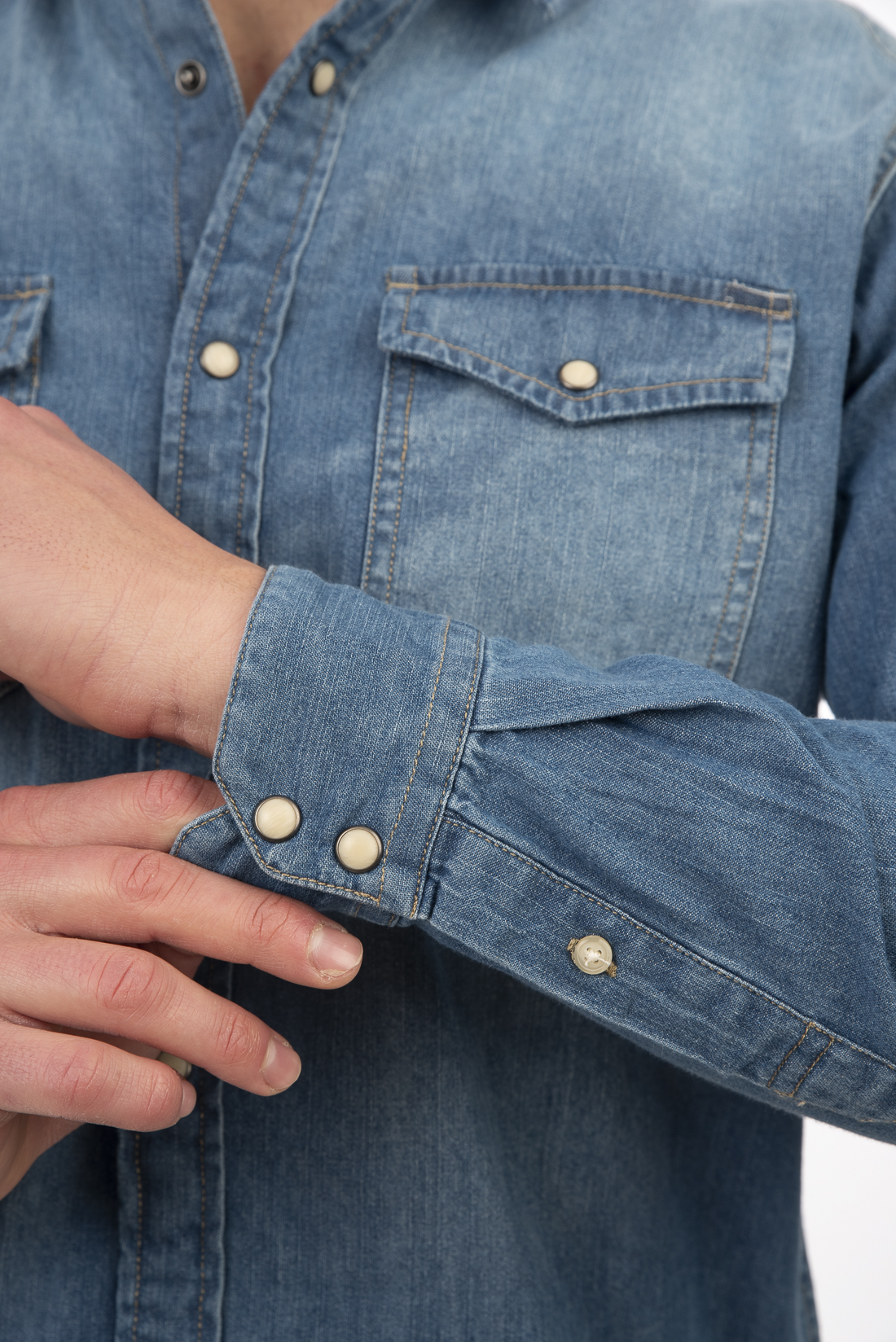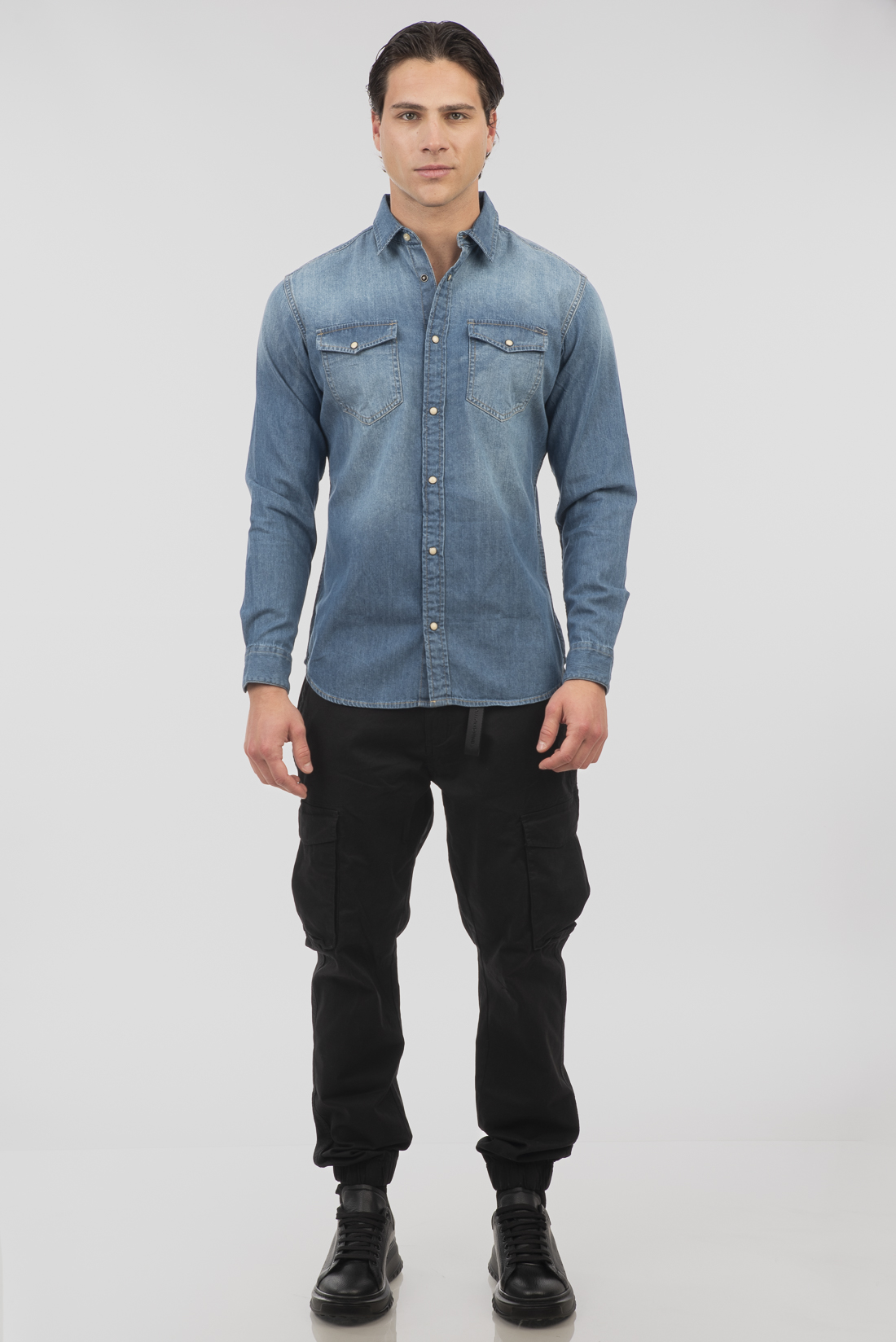 Ανδρικό τζιν πουκάμισο με μακρύ μανίκι, κλείσιμο με κουμπιά, τσέπες μπροστά που κλείνουν με κουμπιά και κανονική εφαρμογή.